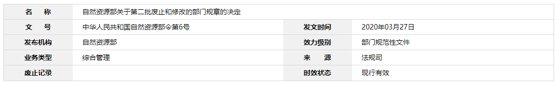 《自然資源部關(guān)于第二批廢止和修改的部門規(guī)章的決定》已經(jīng)2020年自然資源部第1次部務(wù)會議審議通過,現(xiàn)予公布,自公布之日起施行。