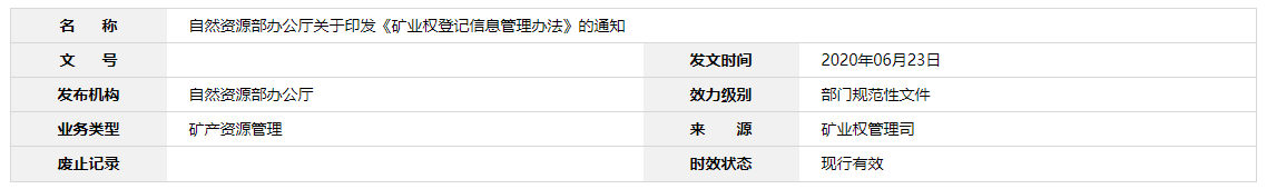 為貫徹落實(shí)國務(wù)院關(guān)于加強(qiáng)事中事后監(jiān)管要求,進(jìn)一步規(guī)范礦業(yè)權(quán)出讓登記行為,加強(qiáng)政務(wù)公開和社會服務(wù),提升礦業(yè)權(quán)管理信息化水平,現(xiàn)印發(fā)《礦業(yè)權(quán)登記信息管理辦法》,請遵照執(zhí)行。如有問題,請及時(shí)告知,F(xiàn)將有關(guān)事項(xiàng)通知如下: