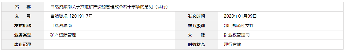 中央或地方財政出資勘查項目,不再新設(shè)置探礦權(quán),憑項目任務(wù)書開展地質(zhì)勘查工作。本意見下發(fā)前已設(shè)探礦權(quán)的,自然資源主管部門可以繼續(xù)辦理探礦權(quán)延續(xù),完成規(guī)定的勘查工作后注銷探礦權(quán),由自然資源主管部門面對各類市場主體公開競爭出讓礦業(yè)權(quán)。