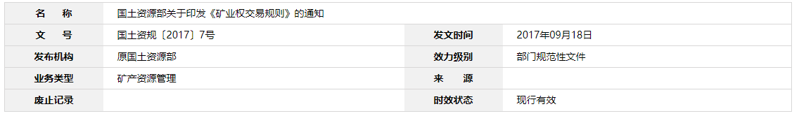 為貫徹落實國務(wù)院整合建立統(tǒng)一的公共資源交易平臺等有關(guān)工作要求,進(jìn)一步規(guī)范礦業(yè)權(quán)交易行為,促進(jìn)礦業(yè)權(quán)市場健康發(fā)展,現(xiàn)將《礦業(yè)權(quán)交易規(guī)則》印發(fā)給你們,請遵照執(zhí)行。