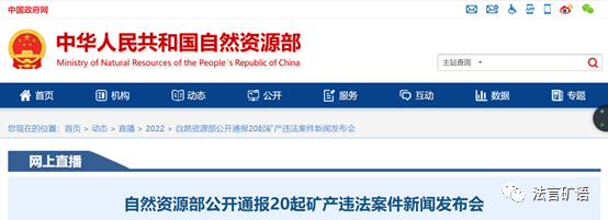 2022年3月17日,自然資源部在官網(wǎng)公開通報了20起礦產(chǎn)違法案件,并召開了新聞發(fā)布會。自然資源部通報的20起案件均涉及非法采礦罪。該新聞發(fā)布會信息鏈接地址為: