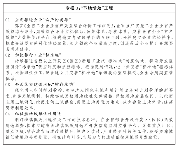 加強(qiáng)自然資源資產(chǎn)配置。健全長期租賃、先租后讓、彈性年期供應(yīng)、作價出資(入股)等工業(yè)用地市場供應(yīng)體系。在符合國土空間規(guī)劃和用途管制要求前提下,調(diào)整完善產(chǎn)業(yè)用地政策,創(chuàng)新使用方式,推動不同產(chǎn)業(yè)用地類型合理轉(zhuǎn)換,探索增加混合產(chǎn)業(yè)用地供給。進(jìn)一步規(guī)范國有經(jīng)營性建設(shè)用地出讓管理,全面推行工業(yè)“標(biāo)準(zhǔn)地”出讓。