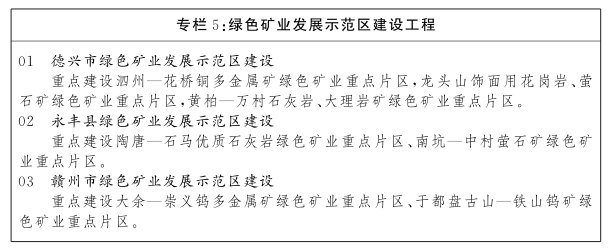 優(yōu)化礦產(chǎn)資源勘查開發(fā)區(qū)域布局。贛北地區(qū)堅持長江經(jīng)濟(jì)帶建設(shè),以不破壞生態(tài)環(huán)境為前提,繼續(xù)做強(qiáng)已有礦業(yè)產(chǎn)業(yè),大力發(fā)展綠色礦業(yè)。環(huán)鄱陽湖地區(qū)主要開發(fā)清潔礦產(chǎn)資源,發(fā)展地?zé)嵘鷳B(tài)旅游產(chǎn)業(yè),推進(jìn)淺層地?zé)崮芾,依托科研?chuàng)新平臺,提高礦產(chǎn)品技術(shù)含量、附加值和競爭力。贛東北地區(qū)重點(diǎn)發(fā)展有色金屬采選冶與精深加工產(chǎn)業(yè),支持稀散元素綜合勘查與回收利用。贛西北地區(qū)以轉(zhuǎn)型升級為主線,推進(jìn)鋼鐵、電瓷、工業(yè)陶瓷、鹽化工、新型建材等優(yōu)勢產(chǎn)業(yè)改造提升,加強(qiáng)關(guān)鍵技術(shù)與產(chǎn)品研發(fā),壯大鋰電新能源產(chǎn)業(yè)。贛中南地區(qū)以贛南等原中央蘇區(qū)振興發(fā)展為契機(jī),加大鋰、金、銀、銅、鉛鋅、錫、地?zé)崴、螢石、高嶺土、硅石等礦產(chǎn)資源勘查開發(fā)力度,推進(jìn)鎢、稀土危機(jī)礦山接替資源勘查。
