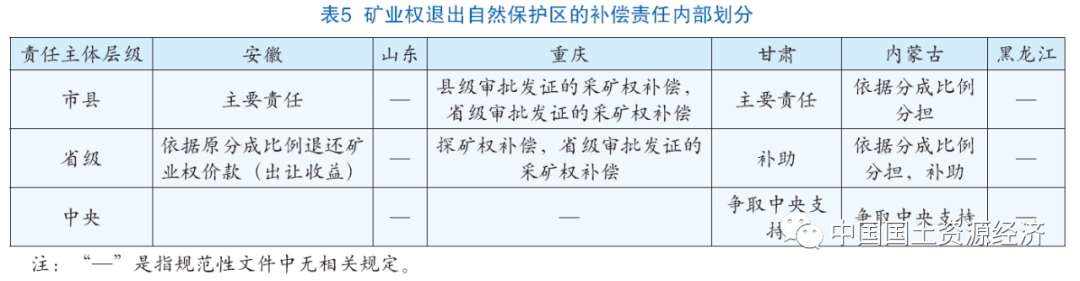 在補(bǔ)償責(zé)任的對(duì)外承擔(dān)上(表4),除黑龍江省、重慶市分別將市級(jí)政府、省級(jí)政府添加為責(zé)任主體外,各地普遍由縣級(jí)政府向礦業(yè)權(quán)人支付補(bǔ)償。在補(bǔ)償責(zé)任的內(nèi)部劃分上(表5),安徽省和甘肅省規(guī)定由市縣承擔(dān)籌措補(bǔ)償資金的主要責(zé)任,內(nèi)蒙古自治區(qū)規(guī)定自治區(qū)、市、縣依據(jù)分成比例分擔(dān)補(bǔ)償責(zé)任,山東省和黑龍江省并無明確規(guī)定。重慶市則按照審批發(fā)證權(quán)限和礦業(yè)權(quán)類型予以區(qū)分,縣級(jí)審批發(fā)證的采礦權(quán)由市縣補(bǔ)償,省級(jí)審批發(fā)證的采礦權(quán)由省市縣分擔(dān)補(bǔ)償,探礦權(quán)由省級(jí)補(bǔ)償。