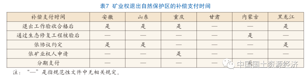 在補(bǔ)償支付時(shí)間上(表7),安徽、山東、黑龍江三省規(guī)定在退出工作驗(yàn)收合格后,依據(jù)協(xié)議約定的時(shí)間向礦業(yè)權(quán)人支付補(bǔ)償;重慶市規(guī)定在退出工作驗(yàn)收合格后,依據(jù)礦業(yè)權(quán)人申請(qǐng)支付補(bǔ)償;內(nèi)蒙古自治區(qū)規(guī)定在通過生態(tài)修復(fù)工程核驗(yàn)后支付補(bǔ)償,并增加了分期支付的規(guī)定。甘肅省未對(duì)補(bǔ)償支付時(shí)間作出明確規(guī)定。