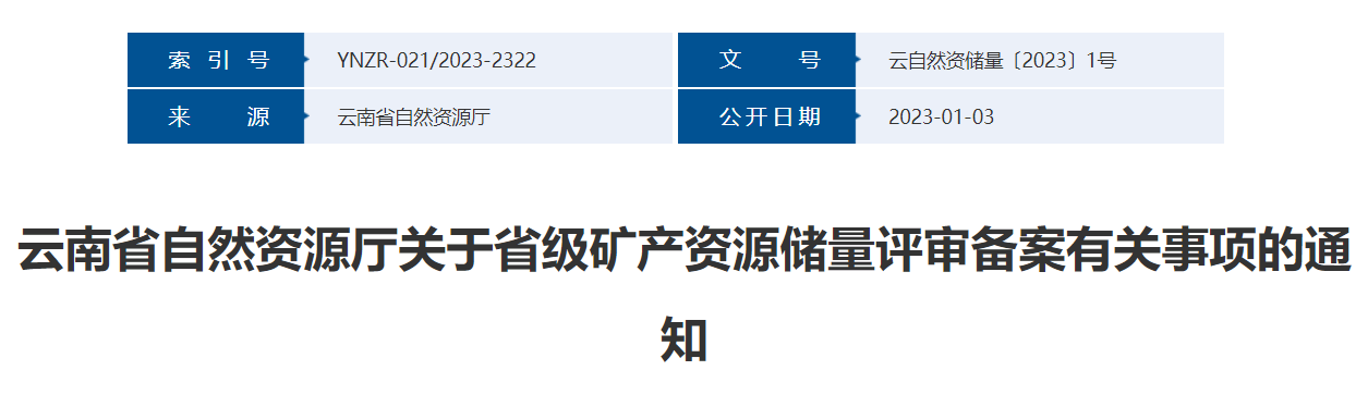 文章來(lái)源于:云南省自然資源廳,原文鏈接:云南省自然資源廳關(guān)于省級(jí)礦產(chǎn)資源儲(chǔ)量評(píng)審備案有關(guān)事項(xiàng)的通知