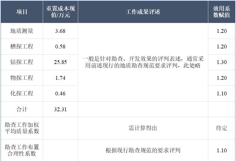 再次,確定效用系數(shù)。用勘查工作加權(quán)平均質(zhì)量系數(shù)×勘查工作布置合理性系數(shù)就可以得出效用系數(shù),在該項(xiàng)目中即1.28×1.10=1.41。
