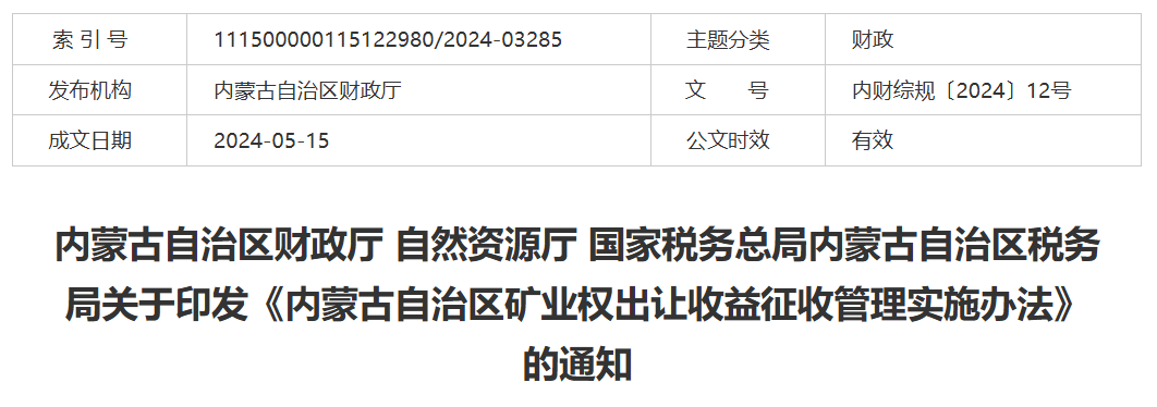 為健全礦產(chǎn)資源有償使用制度,規(guī)范礦業(yè)權(quán)出讓收益征收管理,維護礦產(chǎn)資源國家所有者權(quán)益,促進礦產(chǎn)資源保護與合理利用,根據(jù)《財政部 自然資源部 稅務(wù)總局關(guān)于印發(fā)<礦業(yè)權(quán)出讓收益征收辦法>的通知》(財綜〔2023〕10號)等有關(guān)規(guī)定,結(jié)合我區(qū)礦業(yè)權(quán)出讓收益征收管理工作實際,自治區(qū)財政廳、自然資源廳、國家稅務(wù)總局內(nèi)蒙古自治區(qū)稅務(wù)局共同修訂形成《內(nèi)蒙古自治區(qū)礦業(yè)權(quán)出讓收益征收管理實施辦法》,現(xiàn)印發(fā)給你們,請遵照執(zhí)行。