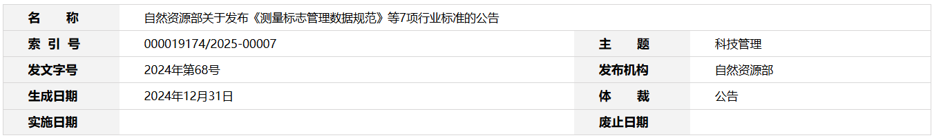 自然資源部關(guān)于發(fā)布《測量標(biāo)志管理數(shù)據(jù)規(guī)范》等7項(xiàng)行業(yè)標(biāo)準(zhǔn)的公告