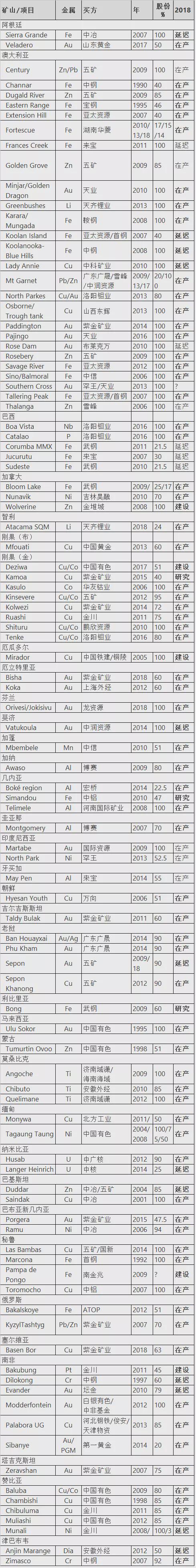 表1中列出了所有由中國所有者控制的、在1995-2018年期間在產的礦山,其中也包括一些僅在表1中突出顯示的年份之間生產的礦山。最后,一些目前接近完成的重大項目也在列表中。這些數(shù)據(jù)包括礦床、項目或礦山的名稱、所涉及的中國公司、所有權份額以及收購或開始項目的年份。如果一項收購是分幾個不同的步驟進行的,則會注明兩個或更多的年份。此外,還注明了1995年、2000年、2005年、2010年、2013年和2018年所處的主要生產金屬和發(fā)展階段(注:受屏幕尺寸限制,本表有所省略,全表請參考原文)。