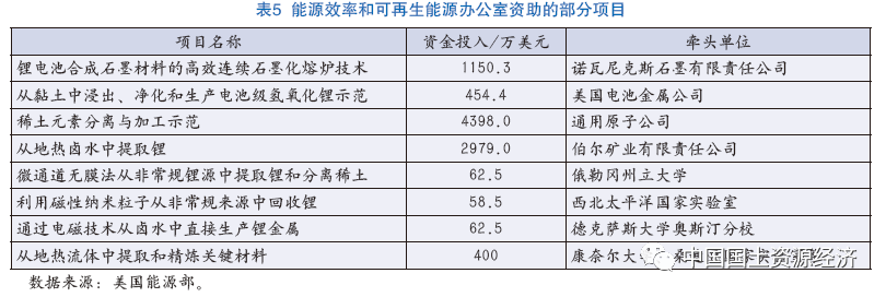 2021年,美國能源部成立礦產(chǎn)可持續(xù)發(fā)展司,旨在從上游、中游到下游促進關(guān)鍵礦產(chǎn)形成環(huán)境、經(jīng)濟和地緣政治可持續(xù)供應(yīng)鏈,并投入大量資金支持相關(guān)技術(shù)的研發(fā)(表4)。同時,成立鋰電池回收研發(fā)中心、關(guān)鍵材料研究所等機構(gòu),促進關(guān)鍵材料技術(shù)的創(chuàng)新。