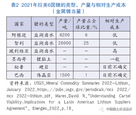 鋰礦產(chǎn)量具有很強(qiáng)的動態(tài)性,基礎(chǔ)設(shè)施、開采技術(shù)和難度等差異都會影響鋰礦開采能力,擁有鋰礦床并不意味可以自動轉(zhuǎn)化為參與鋰市場供應(yīng)的能力,因此鋰資源量與產(chǎn)量不成正比,其中起決定性作用的是鋰礦開采難度系數(shù)。根據(jù)表2,拉美6國的鋰礦主要以鹽湖鹵水鋰為主,基于地質(zhì)開采狀況和基礎(chǔ)設(shè)施情況,阿根廷的鋰礦生產(chǎn)成本最低,是鋰礦分布最為密集的地區(qū)之一。其次是智利,其礦床擁有全球最高的鋰濃度,鋰含量達(dá)到1000毫克/升以上,鎂鋰比為1∶3,是玻利維亞礦床鋰含量的3倍。玻利維亞鋰資源量較高,但由于其鹽水中含有大量雜質(zhì),而且蒸發(fā)過程常被降雨打斷,加之基礎(chǔ)設(shè)施和生產(chǎn)技術(shù)較為落后,產(chǎn)量較為低下,因此,玻利維亞與墨西哥、秘魯一同被美國地質(zhì)局列為儲量不確定的國家,商業(yè)化開發(fā)程度較低。盡管如此,目前玻利維亞國家鋰業(yè)公司(YLB)的碳酸鋰生產(chǎn)已經(jīng)進(jìn)入試驗(yàn)階段,2022年1—11月碳酸鋰出口量達(dá)到600噸,預(yù)計當(dāng)工廠滿負(fù)荷運(yùn)行時,每年產(chǎn)量將達(dá)到上萬噸。墨西哥的礦床是黏土性鋰礦,濃度要低于鹽水型鋰礦,因此開采成本相對較高,生產(chǎn)中不確定性因素很多。2019年,墨西哥索諾拉州發(fā)現(xiàn)鋰礦床,并宣稱這一礦床可能是全球最大的鋰礦床之一,有2.43億噸鋰資源,潛力巨大。1979年至今,在墨西哥已經(jīng)至少發(fā)現(xiàn)57個含鋰地點(diǎn),但由于生產(chǎn)集中度低,目前只有數(shù)10個鋰礦床可開采,仍然處于外國公司的勘探和開發(fā)初期。