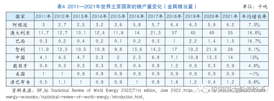 2021年,全球鋰產(chǎn)量為105800噸(表3)。如表3所示,智利、阿根廷、巴西3國鋰產(chǎn)量占全球總產(chǎn)量的32%。智利為全球第二大鋰礦生產(chǎn)國,2021年鋰產(chǎn)量共計26000噸,占全球總產(chǎn)量的25%;排名第一的是澳大利亞,鋰產(chǎn)量為55000噸,占全球總產(chǎn)量的52%;中國排名第三,鋰產(chǎn)量為14000噸,占全球總產(chǎn)量的13%;阿根廷排名第四,鋰產(chǎn)量為6200噸,占全球總產(chǎn)量的6%;巴西鋰產(chǎn)量為1500噸,占全球總產(chǎn)量的1%。如表4所示,目前全球的生產(chǎn)比重很大一部分來自智利,但其相對產(chǎn)量的比重在下降,2011—2021年,智利鋰產(chǎn)量的年均增長率僅為8.1%,遠(yuǎn)遠(yuǎn)落后于澳大利亞的16.8%,阿根廷以7.3%的增長率緊隨智利之后。根據(jù)智利官方估計,到2030年,智利鋰產(chǎn)量在全球總產(chǎn)量中的份額將下降至17%,而阿根廷的鋰產(chǎn)量預(yù)計會增加。