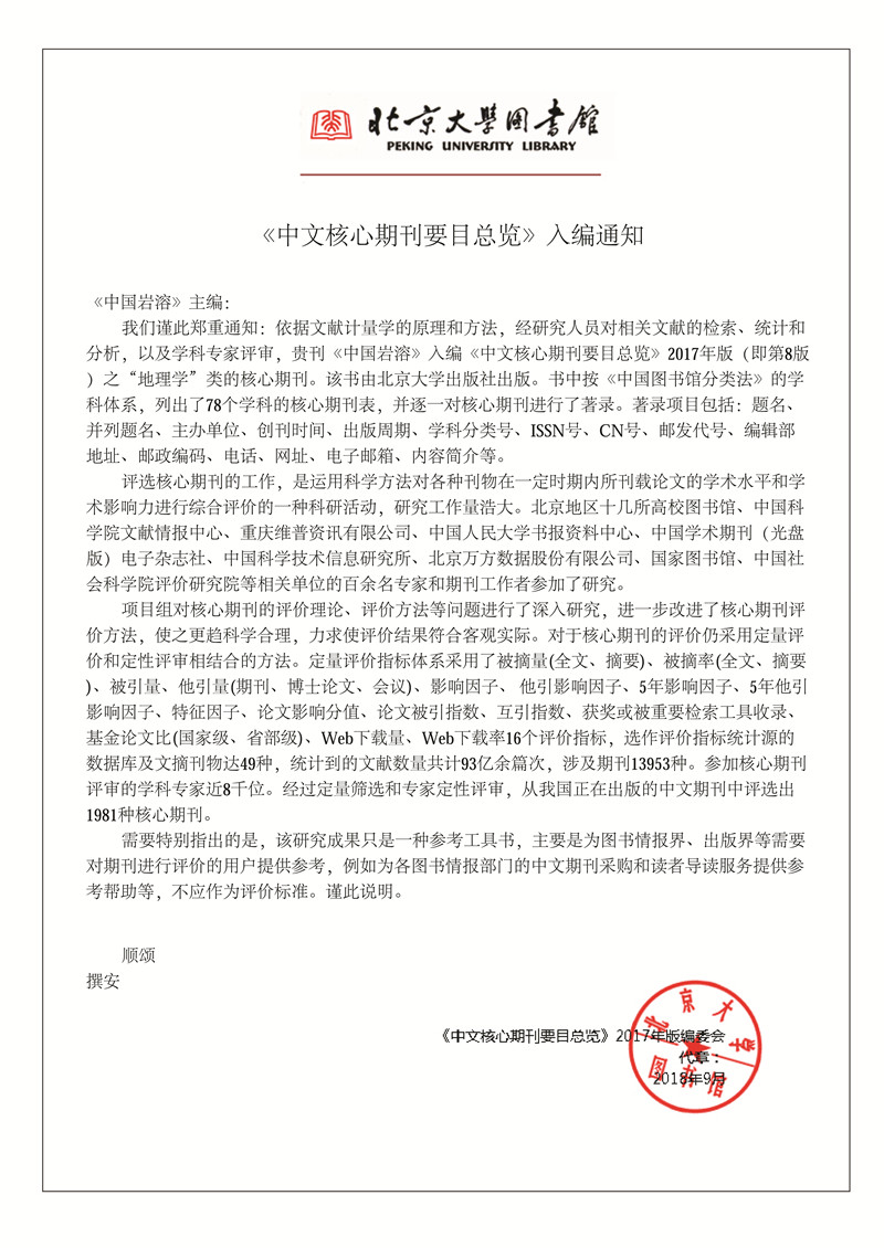 近日,《中國(guó)巖溶》再次入編《中文核心期刊要目總覽》!吨袊(guó)巖溶》已連續(xù)兩次為該總覽收錄,充分顯示了《中國(guó)巖溶》近年來(lái)的學(xué)術(shù)水平和影響力。