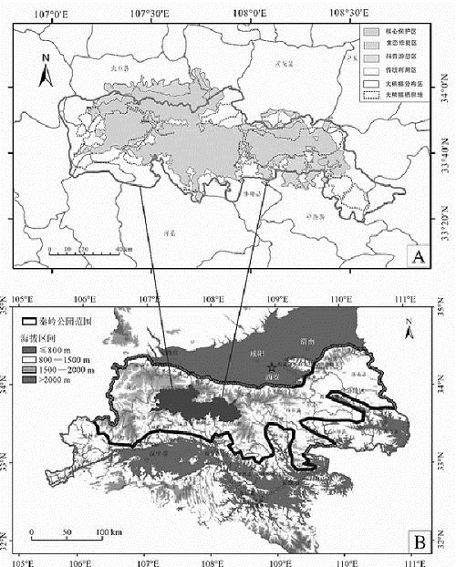 大熊貓國(guó)家公園秦嶺片區(qū)示意圖(A)與秦嶺國(guó)家公園范圍示意圖(B)