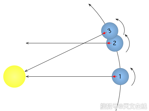 圖解:在像地球的一個順行平面,恒星日是短于太陽日。在時間點1,太陽和遙遠的恒星都在頭頂上(在相同的方向上);在時間點2,行星轉動360°,遙遠的恒星右出現(xiàn)在頭頂上,但太陽并不在頭頂上(1→2 =一恒星日);太陽要稍后,在時間點3,才會抵達頭頂上(1→3 =一太陽日)。