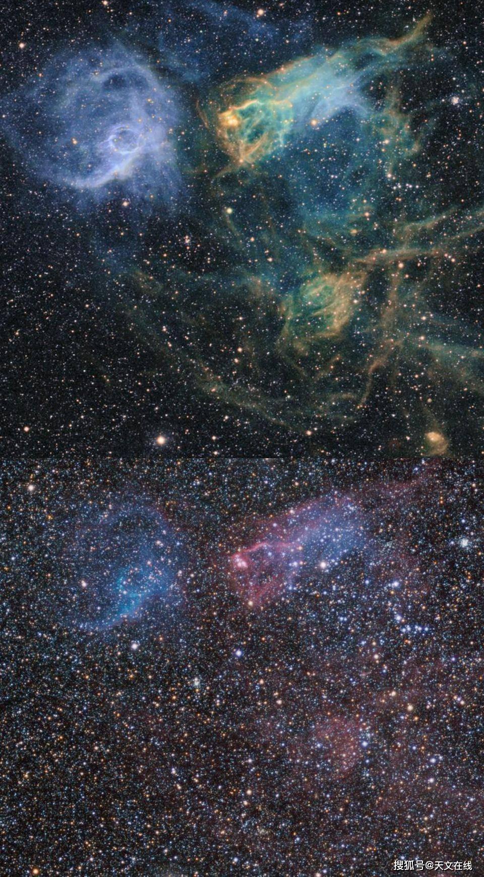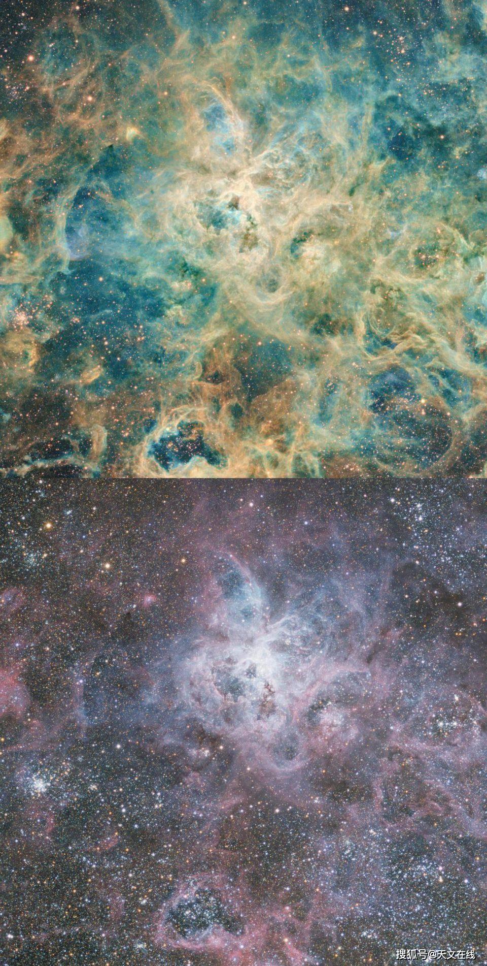 圖解:西爾·奧斯特拉爾團(tuán)隊(duì)作品:蜘蛛星云的大部分區(qū)域,局部星系群的最大恒星形成區(qū)。在上面那張圖里,你可以看到氫氣,硫磺和氧氣存在的痕跡,它們展現(xiàn)了大麥哲倫星云豐富的氣體和等離子體結(jié)構(gòu)。在下面那張圖里,你可以看到RGB色彩合成,這代表了在新形成的年輕恒星中的反射和星云發(fā)散。 圖源:CIEL AUSTRAL