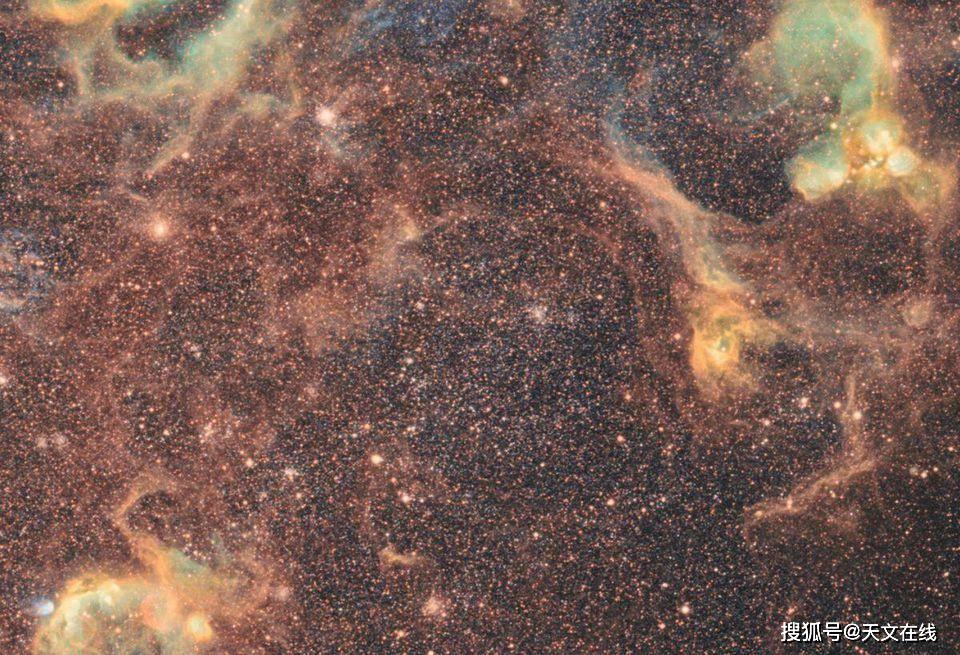 圖解:西爾·奧斯特拉爾團(tuán)隊(duì)制作的大馬賽克中的小區(qū)域位于大麥哲倫星云的中央,但它僅占整個(gè)馬賽克的0.5%。請(qǐng)注意,在這個(gè)紅、綠、藍(lán)組成的彩色空間里,還有很多清晰可見(jiàn)的細(xì)節(jié)。圖源:CIEL AUSTRAL