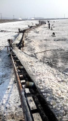 其三,它的硝板礦床并非天然形成,而是人工工藝杰作。1960年代以前,運(yùn)城鹽湖只生產(chǎn)食鹽(氯化鈉)。鹽工將鹵水引入鹽池,在冬季低溫養(yǎng)鹵時(shí),池底首先結(jié)晶的是鎂、鈉復(fù)鹽,即含水的鈉鎂硫酸鹽礦物,這些結(jié)晶礦物質(zhì)當(dāng)時(shí)是無用的“廢物”。年復(fù)一年,最終在北部繞湖的人工鹽池底部,形成白鈉鎂礬礦床,俗稱硝板,這些白鈉鎂礬也是芒硝礦床(別稱硫酸鈉礦床)的主要礦物之一。地質(zhì)專家在硝板中發(fā)現(xiàn)蘆稈等明顯的人工堆積之物,還用碳-14方法測得硝板年齡為4600年左右,遠(yuǎn)小于鹽湖的250萬年地質(zhì)年齡。20世紀(jì)60年代起,由于化工科技進(jìn)步,人們發(fā)現(xiàn)硝板中富含的鎂和鈉可以提取出來使用,于是,這些厚度不等,最厚可達(dá)幾米的無用之物又成為鹽湖人眼中之寶。硝板作為鹽工曬鹽工藝而形成的人工礦體,世界鮮見。