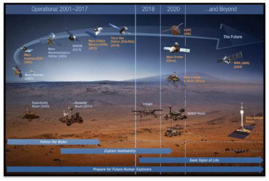 從上面的圖中可以看到,圍繞著水的尋找,人類從環(huán)繞器的三個(gè)探測器加上“機(jī)遇號”火星車,開展了很多研究工作。圍繞著可居住性發(fā)射了軌道探測器、微量氣體探測器以及“好奇號”火星車,進(jìn)行了各種探測活動。最近一次人類成功在火星上降落的是“洞察號”火星著陸器,它是研究磁場和大氣是怎樣的情況、多久消失的,另外還要進(jìn)行類地行星的研究。