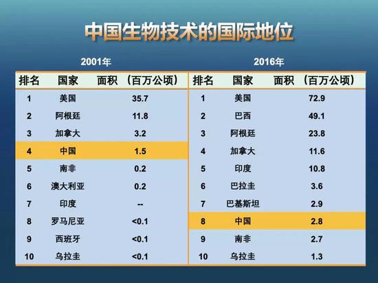 遺憾的是,由于中國(guó)現(xiàn)在對(duì)轉(zhuǎn)基因技術(shù)應(yīng)用的不同聲音,發(fā)展并不理想。在2001年的時(shí)候,我國(guó)轉(zhuǎn)基因作物的種植面積在全世界排名第四,僅次于美國(guó)、阿根廷和加拿大。然而,經(jīng)過十幾年的發(fā)展,中國(guó)轉(zhuǎn)基因作物的種植面積已退后到了排名第八。從前印度遠(yuǎn)遠(yuǎn)落后我們,但現(xiàn)在印度的轉(zhuǎn)基因作物種植面積已經(jīng)超過我們將近3倍,甚至像人口只有600萬(wàn)的巴拉圭以及巴基斯坦都已經(jīng)在排在我們前面。這跟我國(guó)的生物科技發(fā)展實(shí)力以及國(guó)際地位極不相符。