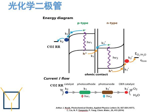 P型半導體表面所做的反應就是二氧化碳的還原半反應,二氧化碳還原可以產(chǎn)生各種各樣的產(chǎn)物,也包括綠葉里面的碳水化合物。另外一邊的半反應就是水氧化,也就是綠葉里面另外一個半反應——水氧化變成氧氣。所以這么一個光化學二極管,在實驗室里面通過兩類催化劑和兩類半導體的集成之后,最終的功能是一樣的。雙光子吸收加上兩個半反應,最終的全反應就是二氧化碳、水、加上太陽能,雙光子,變成二氧化碳還原的產(chǎn)物——化學品和氧氣。
