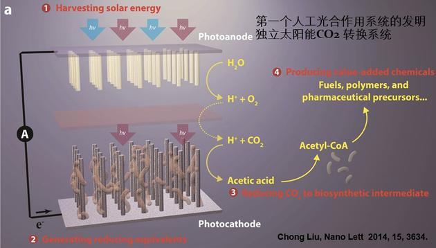 所以作為一個愿景,2003年啟動太陽能計劃,在這十幾年中間,從在圖紙上畫出一個高比表面積的半導體,到集成一個人工光合作用的體系,再到第一次在實驗室當中把二氧化碳、水轉化成所需要的化學品,這些就是我們一步一步完成的工作。