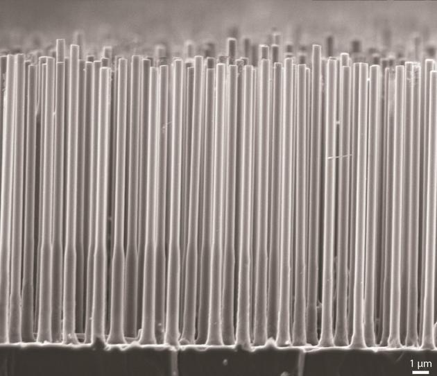 下圖是一張電子顯微鏡拍的照片,這是一個三維的納米導線陣列,納米基本上是頭發(fā)絲的一千到一萬分之一的尺度。三維的高比表面積空間,可以在表面負載催化劑,生物催化劑也好,實驗室合成催化劑也好,都可以用來做化學反應。