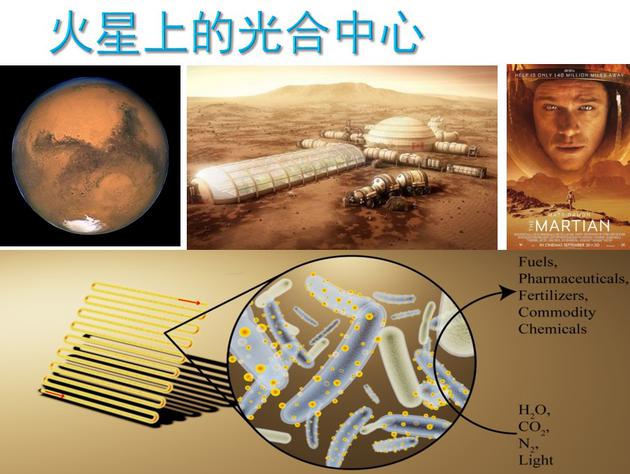 很有意思的是,美國宇航局2017年在伯克利成立了一個科研中心,來試探人工光合作用在火星表面未來的應用。我們來粗略計算一下。比如將來去火星的第一批宇航員有6個或12個人,想像我們的系統(tǒng)能做到一個立方米(1000L)。以現(xiàn)在的的轉化效率來說,能夠做到350g/day/1000L,再轉化到丁醇是100g/day/1000L。我們需要考慮宇航員每天、每個月、每年需要多少燃料、化學品和藥品,然后進一步把這個系統(tǒng)優(yōu)化,繼續(xù)增加產(chǎn)量。利用盡量小的體積,來生產(chǎn)盡可能多的燃料、化學品加上藥品,這是我們接下來要做的一個非常有希望成功的事情。
