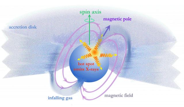 而當(dāng)中子星的位置處于普通伴星周圍的近軌道之上時(shí),便能夠捕獲那些從恒星流出的物質(zhì),這些被捕獲的物質(zhì)將在該中子星的周圍打造一個(gè)圓盤,這個(gè)圓盤最終將會(huì)向下旋轉(zhuǎn)掉落,直至完全被吸收到中子星上。這些物質(zhì)會(huì)隨著加速而獲得巨大的能量,而能量中的大部分都會(huì)在X射線能量下被輻射掉,熱區(qū)會(huì)在中子星旋轉(zhuǎn)時(shí),在熱區(qū)移入和移出的視野中產(chǎn)生X射線脈沖。物質(zhì)流入中子星產(chǎn)生了增生動(dòng)力脈沖星,需要像伴星這樣豐富的催化氣體來源?茖W(xué)家們認(rèn)為,吸收中子星的各種行為,都與物質(zhì)落入中子星的細(xì)節(jié)之間有密切的關(guān)聯(lián)。