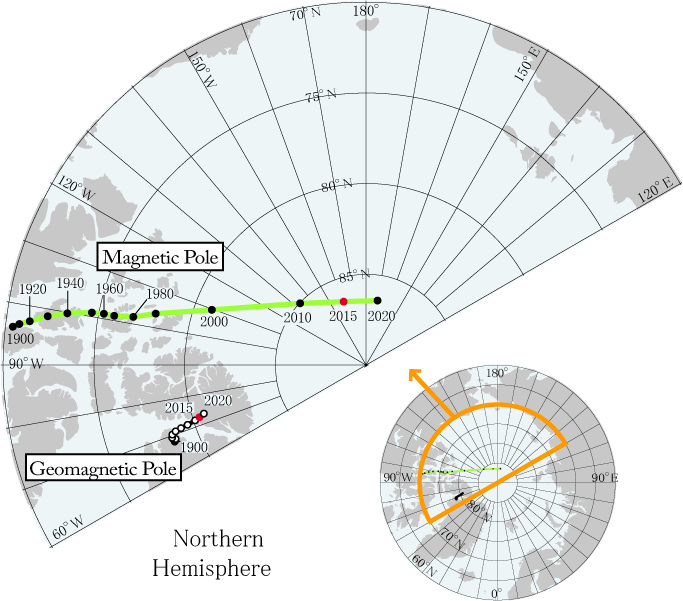 地球磁場(chǎng)移動(dòng)在地質(zhì)科學(xué)探測(cè)記載以來,經(jīng)歷了大約四百年的相對(duì)穩(wěn)定,在進(jìn)入20世紀(jì)后,北極磁場(chǎng)移動(dòng)開始加速,并向北冰洋移動(dòng)了近1000多公里。目前,仍以每年約50公里的異常速度朝西伯利亞地區(qū)移動(dòng),似乎并沒有停下來的跡象。相反,南極磁場(chǎng)移動(dòng)的速度比較緩慢,每年移動(dòng)速度為10公里。一些科學(xué)家認(rèn)為,這種快速的遷移是地球地磁逆轉(zhuǎn)的跡象之一。