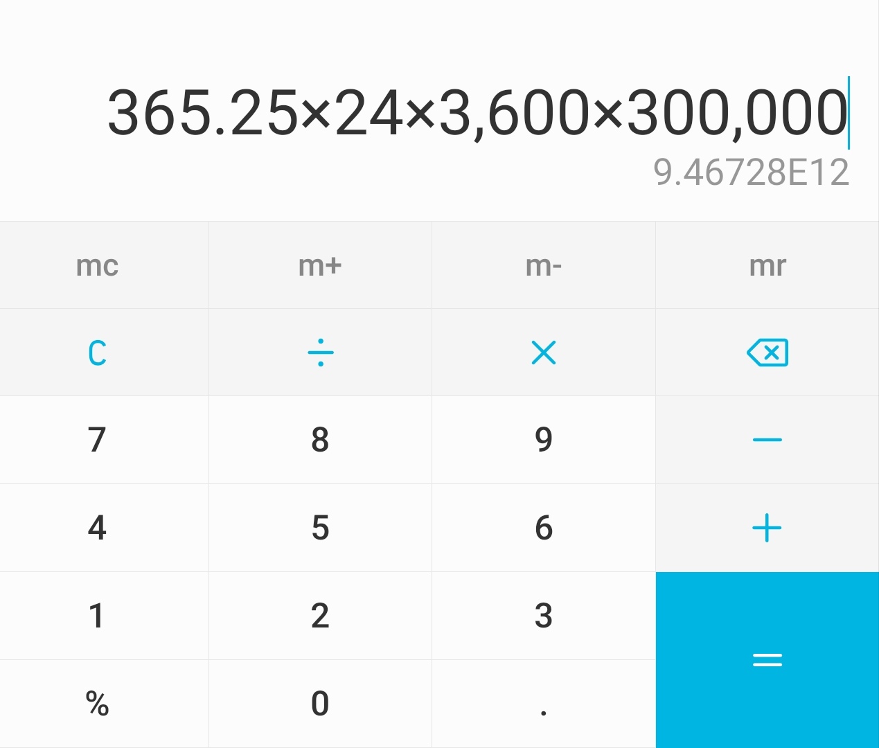 而光走一年就是大約是:365.25×24×3,600×300,000≈9467280000000公里……
