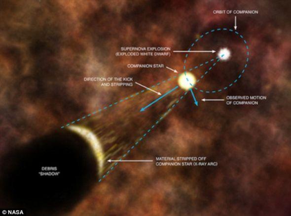 甚至超新星爆發(fā)都可能摧毀它的伴星,上圖是第谷Ia型超新星爆發(fā)時伴星得以幸存的示意圖,這算是一個比較不錯的結(jié)果!超新星爆發(fā)都可能摧毀恒星,它星系內(nèi)的行星就更不在話下了!