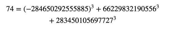 74 = (-284650292555885)³ + (66229832190556)³ + (283450105697727)³