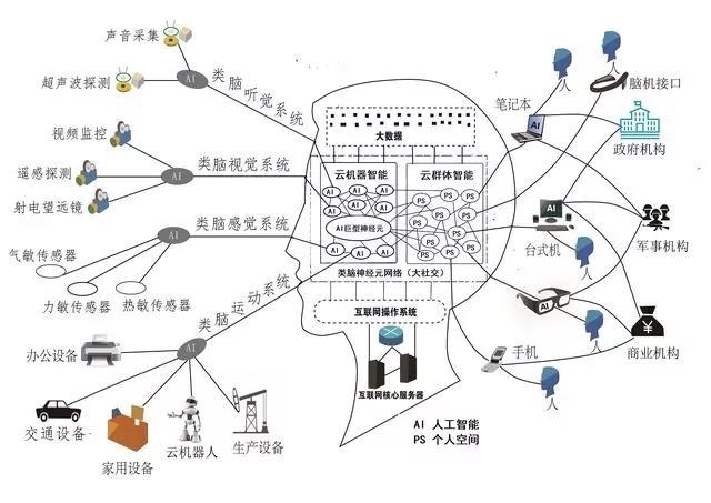 2004年社交網絡為代表的類腦神經元網絡,2005年云計算為代表的類中樞神經系統(tǒng),2009年物聯網為代表的類感覺神經系統(tǒng),2012年工業(yè)互聯網、工業(yè)4.0為代表的類運動神經系統(tǒng),2013年大數據,2015年人工智能為代表的智能驅動力,到2018年阿里大腦、騰訊大腦、360安全大腦、滴滴交通大腦等不斷涌現,連同之前的谷歌大腦、百度大腦、訊飛超腦,到2019年,互聯網大腦的雛形已越來越清晰。