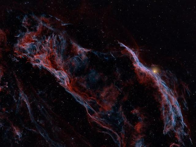 這些外觀精美的激震熾熱絲狀云氣飄浮在地球天空中的天鵝座方向,并構(gòu)成了面紗星云的西部。