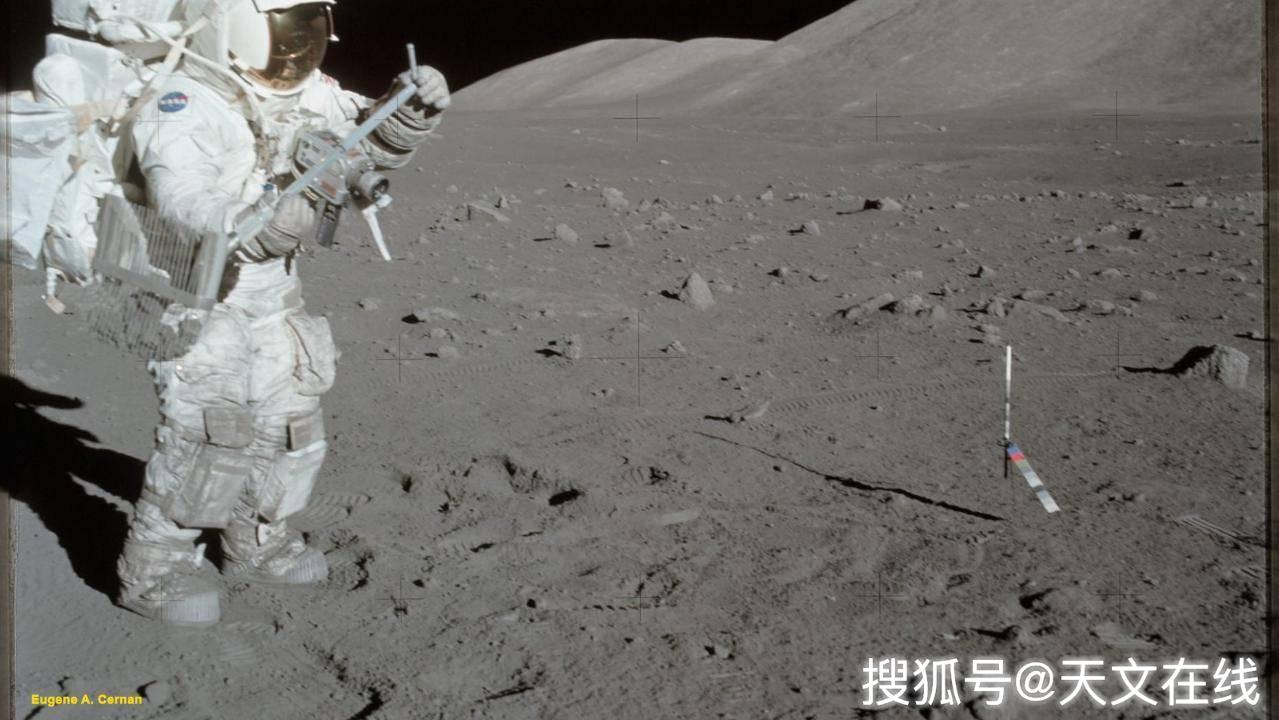 圖解:阿波羅17月球宇航員哈里森施密特在第一次太空行走任務(wù)期間,在陶拉斯-利特羅峽谷地區(qū)登陸地點(diǎn)收集月球樣本。圖片:NASA