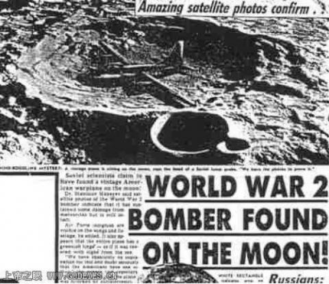 1987年3月蘇聯(lián)人造衛(wèi)星從月球背面發(fā)回的傳真照片察看,有一架“二戰(zhàn)”時(shí)期的美制老式轟炸機(jī),停放在月球的隕石坑邊,機(jī)身機(jī)翼都有明顯的美國(guó)空軍旗標(biāo),有人推測(cè)可能是外星人擄到月球上去的。蘇美兩國(guó)科學(xué)家曾打算成立一個(gè)特別小組進(jìn)行秘密調(diào)查,可是蘇聯(lián)衛(wèi)星于1988年7月再次掃瞄該地時(shí),飛機(jī)已神秘消失,暗中監(jiān)控的美國(guó)專家承認(rèn)該架飛機(jī)是7月22日從月面失蹤的。
