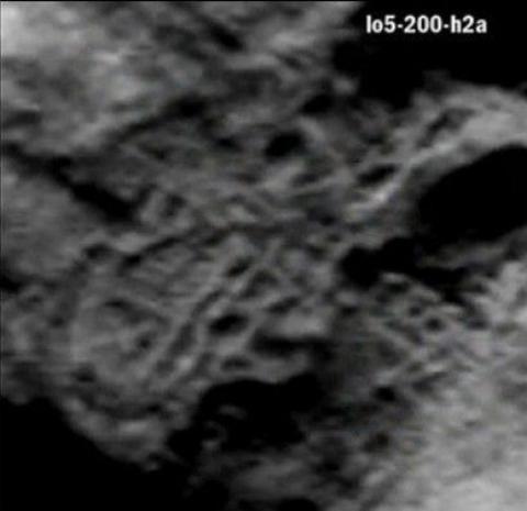更為獨(dú)特的是另一座環(huán)形山,它們邊緣平滑,過(guò)于完整,環(huán)內(nèi)呈幾何圖形,有仿佛是劃出來(lái)的平分線,在圓周的幾何中心部位,有墻壁及其投影。該山外側(cè)有一傾斜的坡面,其形狀有如完整的正方形,在正方形內(nèi)有一個(gè)十字,把正方形等分成對(duì)稱的各部分。