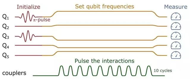 圖注:理想化的五量子比特設(shè)置,1號和3號量子比特初始設(shè)為激發(fā)態(tài),經(jīng)歷10次獨立的脈沖(量子門)然后得到最終結(jié)果。如果通過量子門的總時間比退相干時間短得多,就能夠獲得與預(yù)期相符的量子計算結(jié)果。