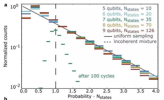 在量子計算領(lǐng)域,至少有一個最終狀態(tài)出現(xiàn)概率極低,而且同樣遵循特定的波特·托馬斯分布(porter-thomas distribution)。如果量子計算機狀況良好,就可以執(zhí)行任意多次運算,再讀取結(jié)果查看是否符合預(yù)期的分布情況。