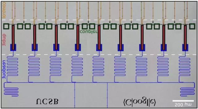 圖注:如圖所示是一個九量子比特量子電路,灰色區(qū)域代表鋁板,深色區(qū)域表示鋁被蝕刻的部分,各種顏色用于區(qū)分不同的電路元件。此類計算機使用超導(dǎo)量子比特,必須在毫開爾文級溫度(degree kelvin,開爾文溫度和人們習慣使用的攝氏溫度相差一個常數(shù)273.15,即T=t+273.15(t是攝氏溫度的符號))下保持極低溫,且運行時長需遠低于50微秒。