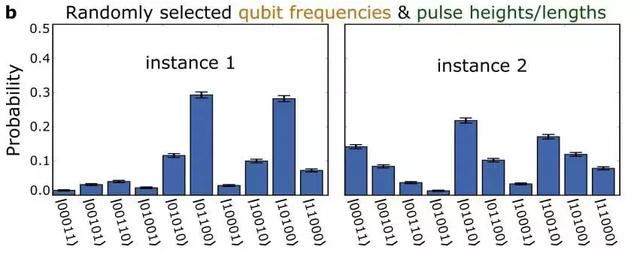 圖注:以10100開始實驗,并經(jīng)過10次耦合脈沖(coupler pulse,比如量子運算),10種狀態(tài)并不會均勻分布,而且有極端高值。根據(jù)量子計算機結(jié)果,即可確定其是否符合預(yù)期的量子活動。