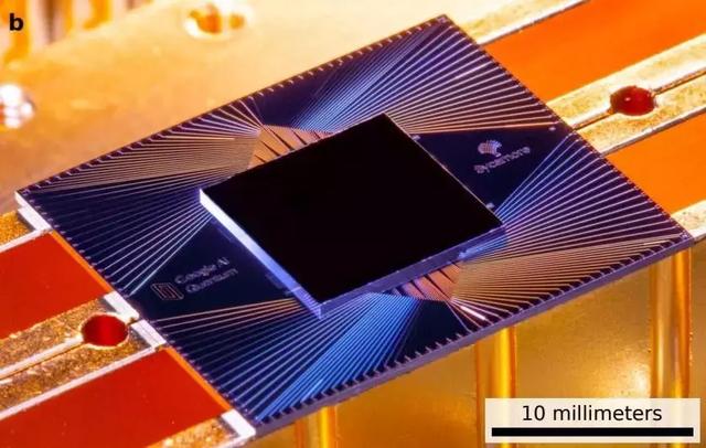 圖注:Sycamore處理器是一個包含54量子比特的矩形陣列(因為有一個量子比特無法使用,也就是一款擁有53個有效量子比特的系統(tǒng)),耦合器將鄰近的4個量子比特連結(jié)。上圖展示Sycamore芯片尺寸和顏色。