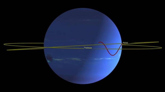 雖然兩顆衛(wèi)星的軌道相對較近,但它們的不同軌道使彼此相距超過約2200英里。那是因為以更快的速度運行的Naiad被鎖定為一種波動的運動,以確保兩顆衛(wèi)星永遠不會“偶遇”。無論兩顆衛(wèi)星完成其宿主行星軌道的次數(shù)多少,其模式都保持不變,Thalassa在其軌道上平穩(wěn)運行,隨著Naiad的軌道呈鋸齒形,在其在姊妹衛(wèi)星的軌道上方或下方運行。