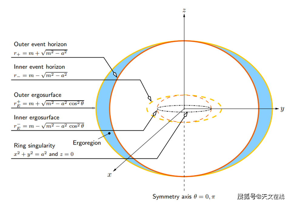 圖解:1963年羅伊·克爾找到了具有質(zhì)量和角動(dòng)量的黑洞的精確解。它揭示的并非是一個(gè)單一的具有點(diǎn)狀奇點(diǎn)的視界,而是一個(gè)內(nèi)外視界,以及一個(gè)內(nèi)外能層,外加一個(gè)半徑相當(dāng)大的環(huán)狀奇點(diǎn)。(圖源:MATT VISSER, ARXIV: 0706.0622)