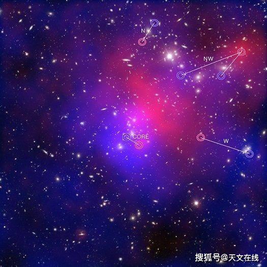 圖解:此圖展示了至少四個星系團(tuán)間的一次復(fù)雜碰撞。天文學(xué)家將之稱為“潘多拉星系團(tuán)”,因?yàn)樗胁煌慕Y(jié)構(gòu)都能在其中找到。那些從未被看到過的奇怪效應(yīng)顯然因?yàn)檫@種撞擊被產(chǎn)生出來了。