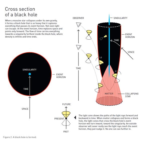 黑洞的形成 (左上) 黑洞橫截面 當(dāng)一顆巨大的恒星在自身引力作用下塌縮時(shí),它會(huì)形成一個(gè)質(zhì)量很大的黑洞,捕獲穿越其事件視界的一切東西。哪怕是光都無法逃離黑洞。在事件視界中,時(shí)間取代空間,所有路徑向內(nèi)指。時(shí)間流將一切帶向黑洞最深處的奇點(diǎn)——在這里,密度是無限的,時(shí)間也止于此。 (右下) 光錐表示光線在時(shí)間上向前和向后的路徑。當(dāng)物質(zhì)塌縮并形成黑洞時(shí),穿過黑洞事件視界的光錐將向內(nèi)朝奇點(diǎn)運(yùn)動(dòng)。外部的觀察者永遠(yuǎn)不會(huì)真正看到光線到達(dá)事件視界。他們看到的,只是光線接近事件視界。之后的就沒有人能看到。