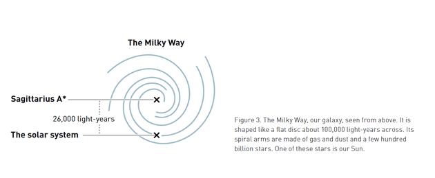 圖3:銀河系俯視圖。我們的銀河系狀似一張圓盤,直徑達(dá)到10萬光年。銀河系的漩渦臂由云氣和塵埃以及幾千億顆恒星組成;其中之一就是我們的太陽。