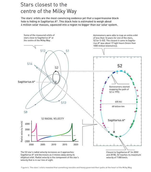 右下:在最靠近人馬座A*(2002年和2018年)時(shí),恒星S2的速度達(dá)到最高的每秒7000公里